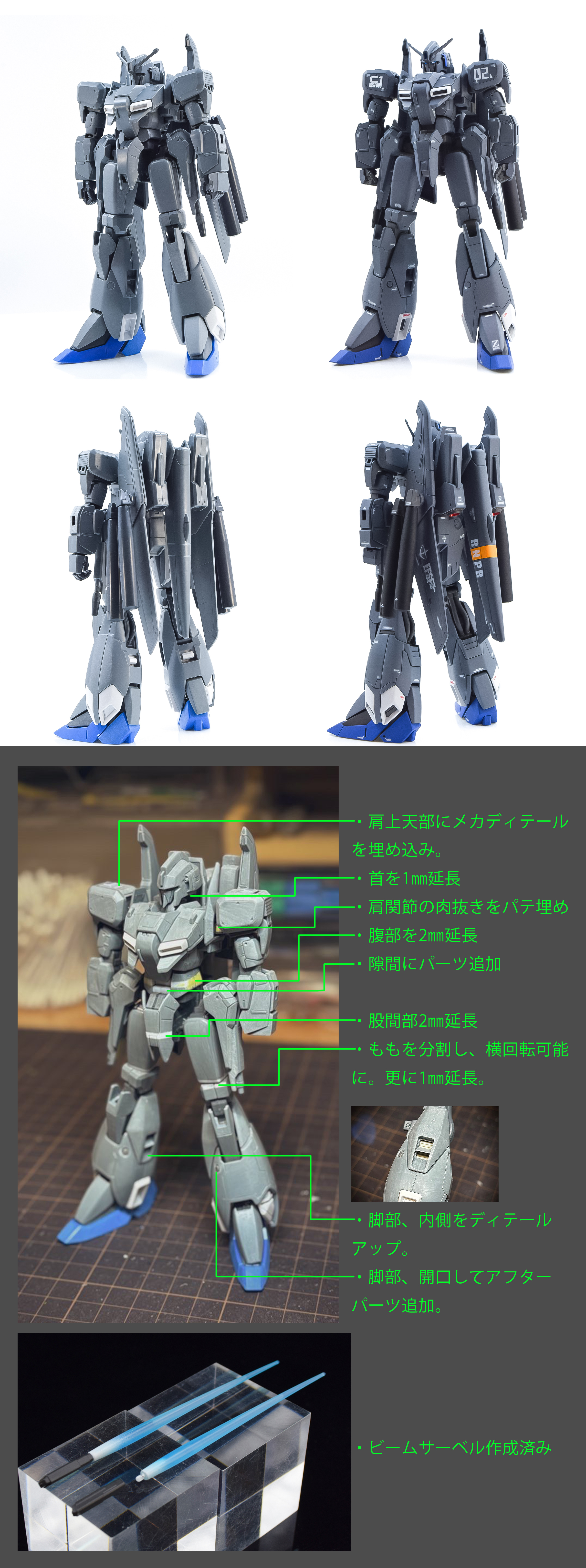 胴体の延長、スジボリやメカパーツ等をメインにディテールアップしています。