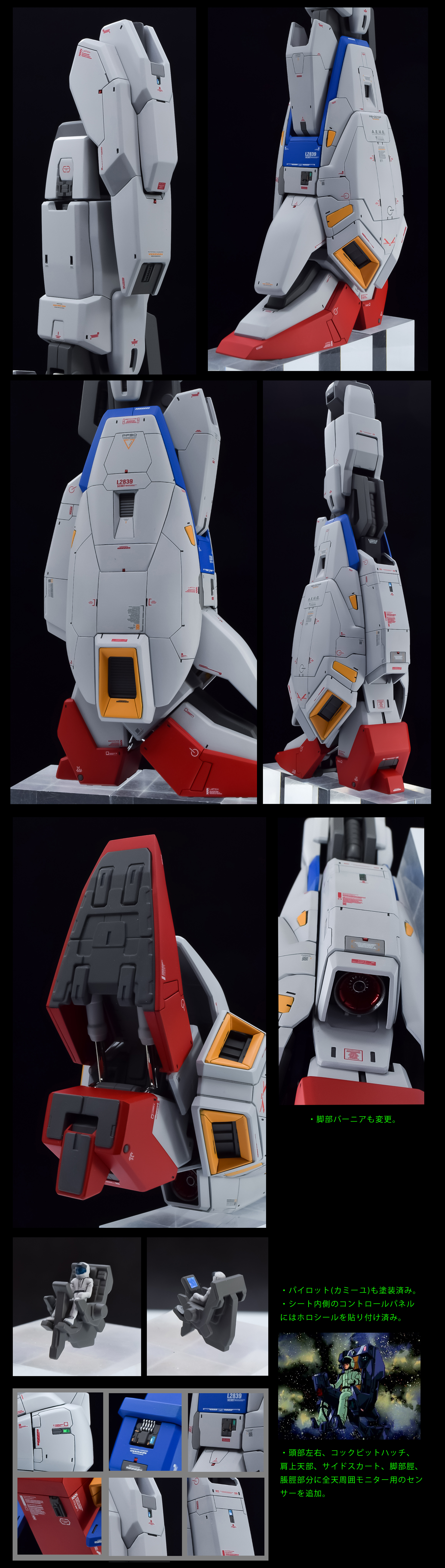首、腹部、腿を延長しスタイル改修後、スジボリ、メカパーツ等で全体をディテールアップしました。